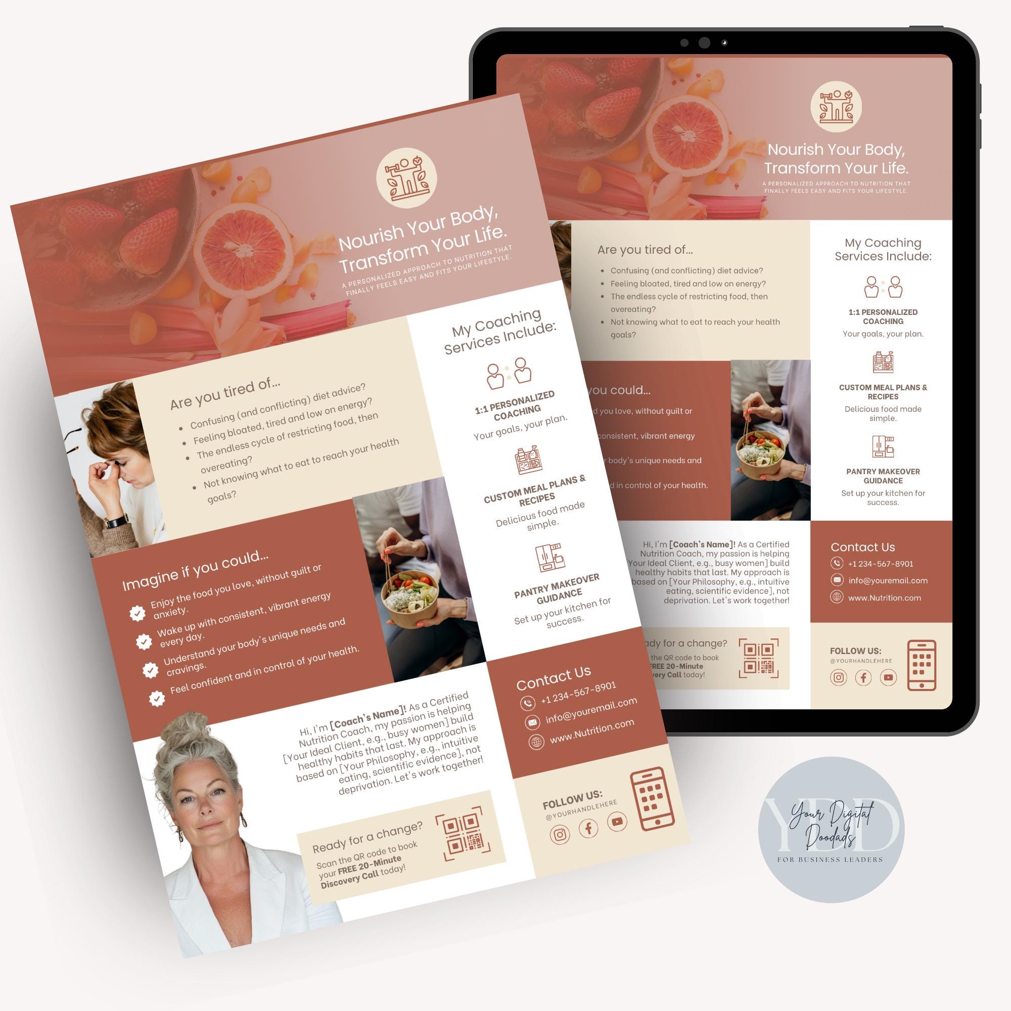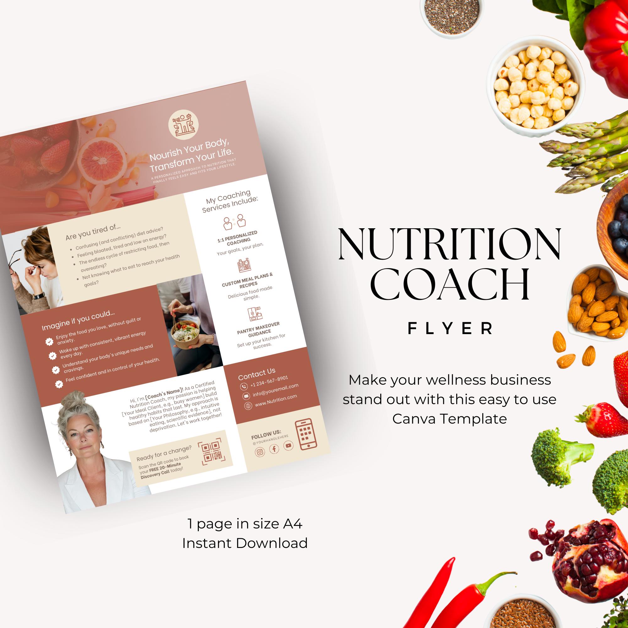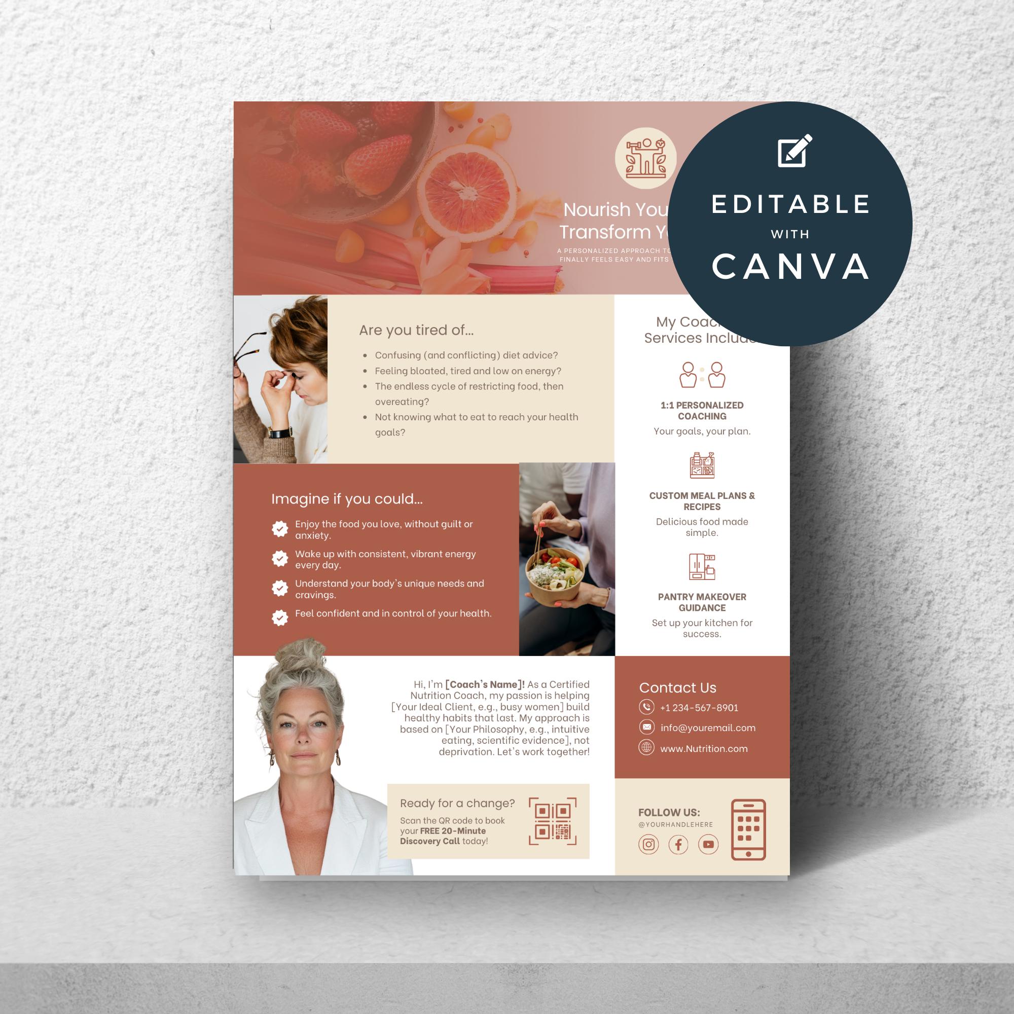 Make your wellness business stand out with this 1-page Wellness Coach Canva Flyer Template! Perfect for nutritionists, health coaches, diet coaches, and registered dieticians, this fully editable health flyer is designed to help you promote your services with professionalism and style.