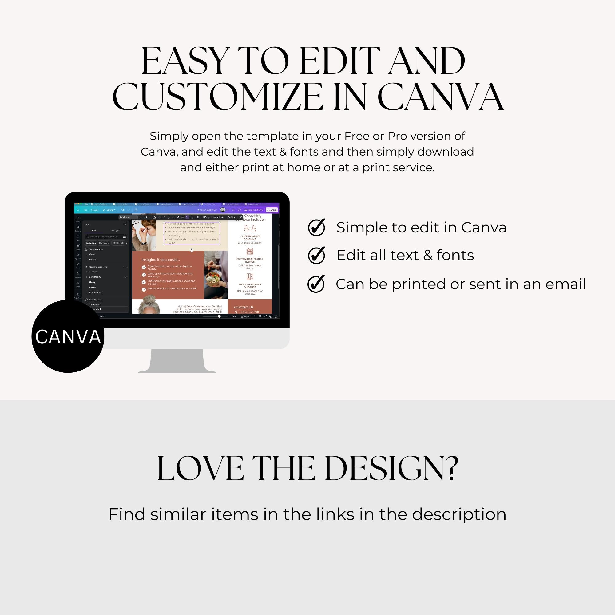 Whether you specialize in holistic health, healthy eating, or nutrition coaching, this template makes it easy to create a polished, modern promo. Customize the text, colors, and images in Canva to match your personal brand in minutes—no design experience needed!