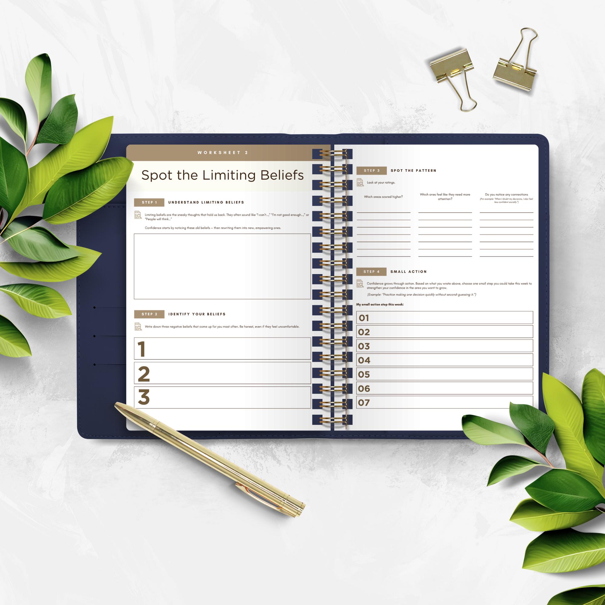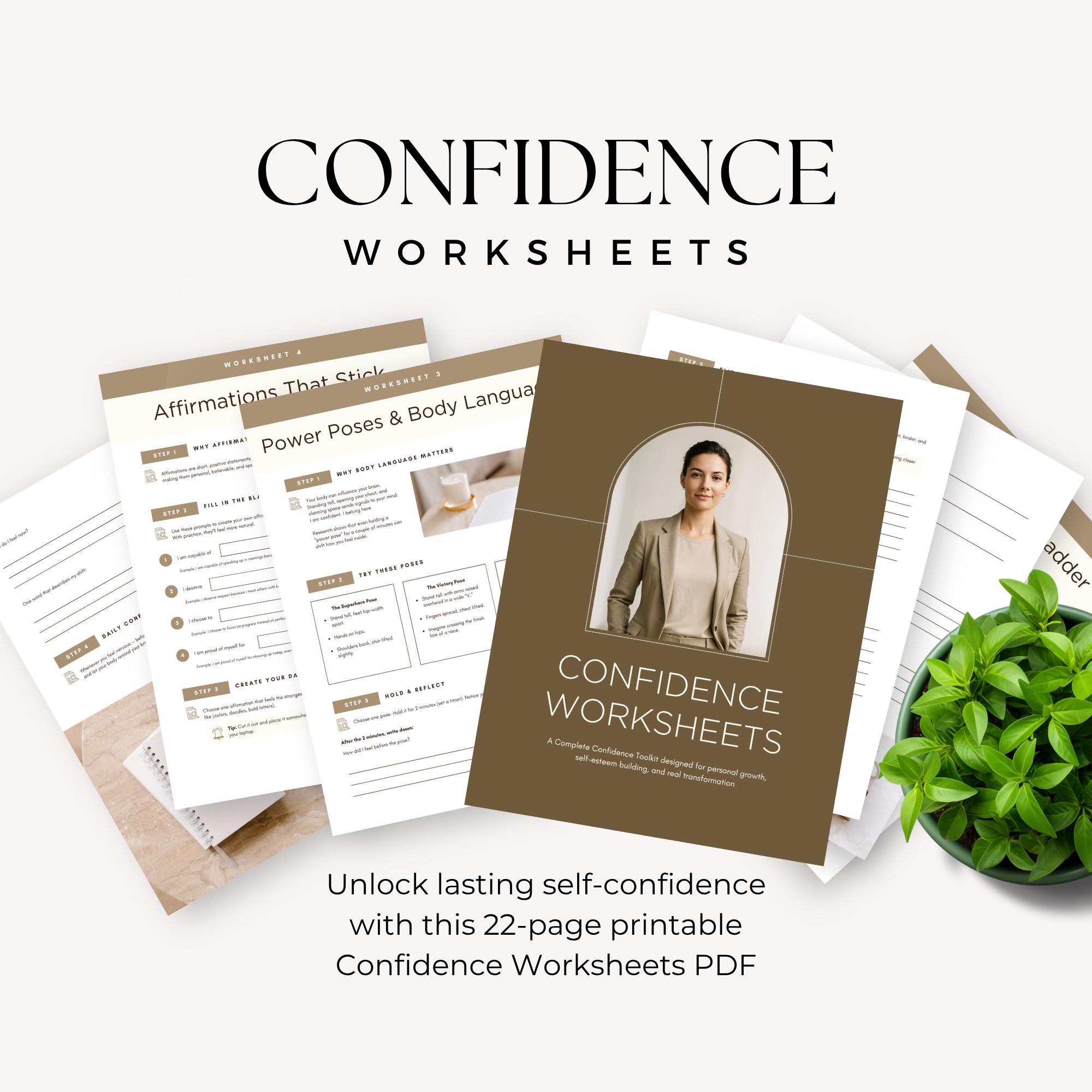 Unlock lasting self-confidence with this 22-page printable Confidence Worksheets PDF - designed for personal growth, self-esteem building, and real transformation. Perfect for therapists, life coaches, and entrepreneurs looking to empower clients or themselves!