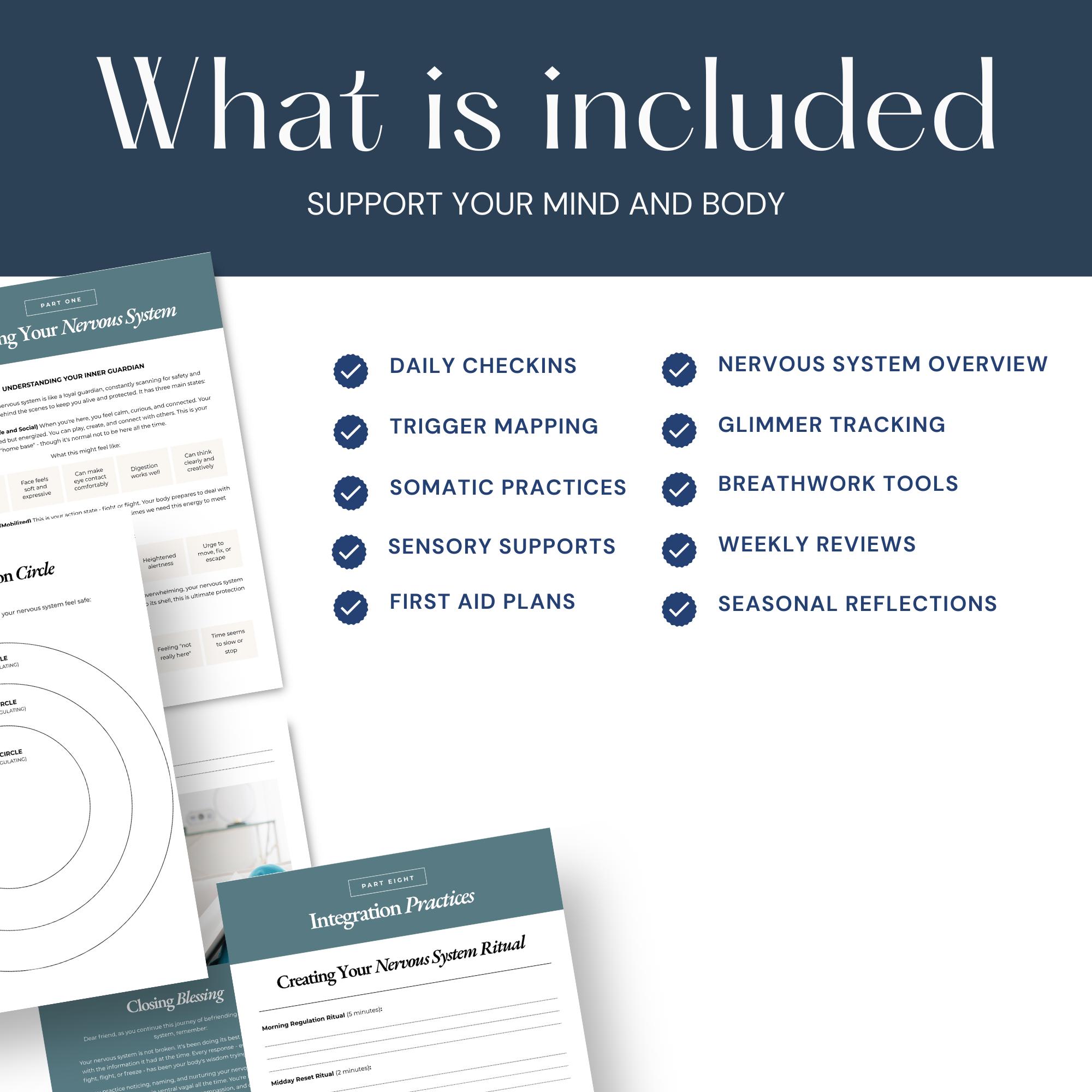 Support your mind and body with this gentle Nervous System Workbook — a printable mental health kit designed for calm, clarity, and simple daily care. Use it as a mindful journal, self care guide, or wellness journal to track triggers, glimmers, and emotional patterns.