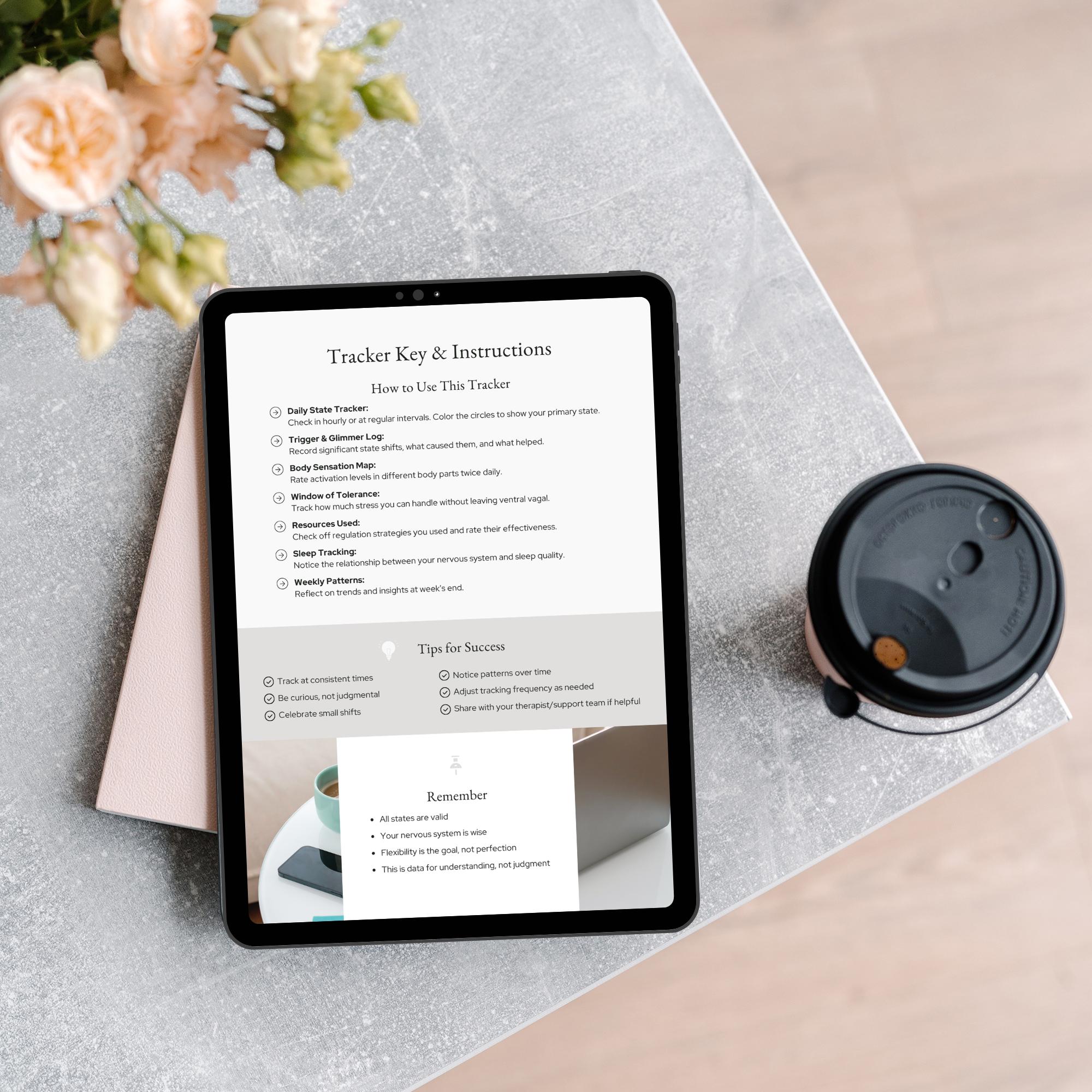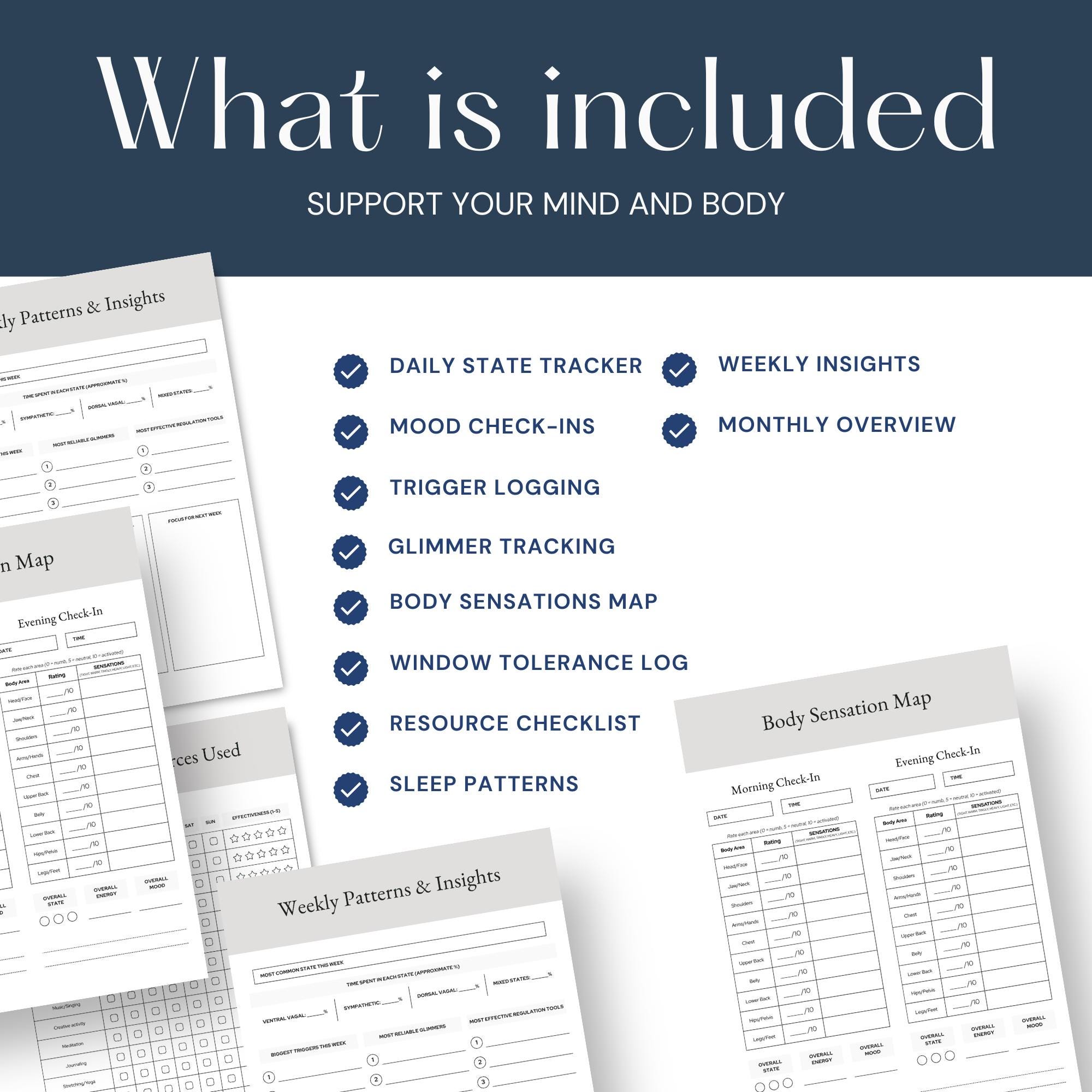 Inside you’ll find daily check-ins, mood + state tracking, therapy-inspired worksheets, window of tolerance logs, resource use pages, sleep patterns, weekly insights, and a monthly overview for deeper reflection. Perfect for trauma support, coaching, or personal mental health routines.