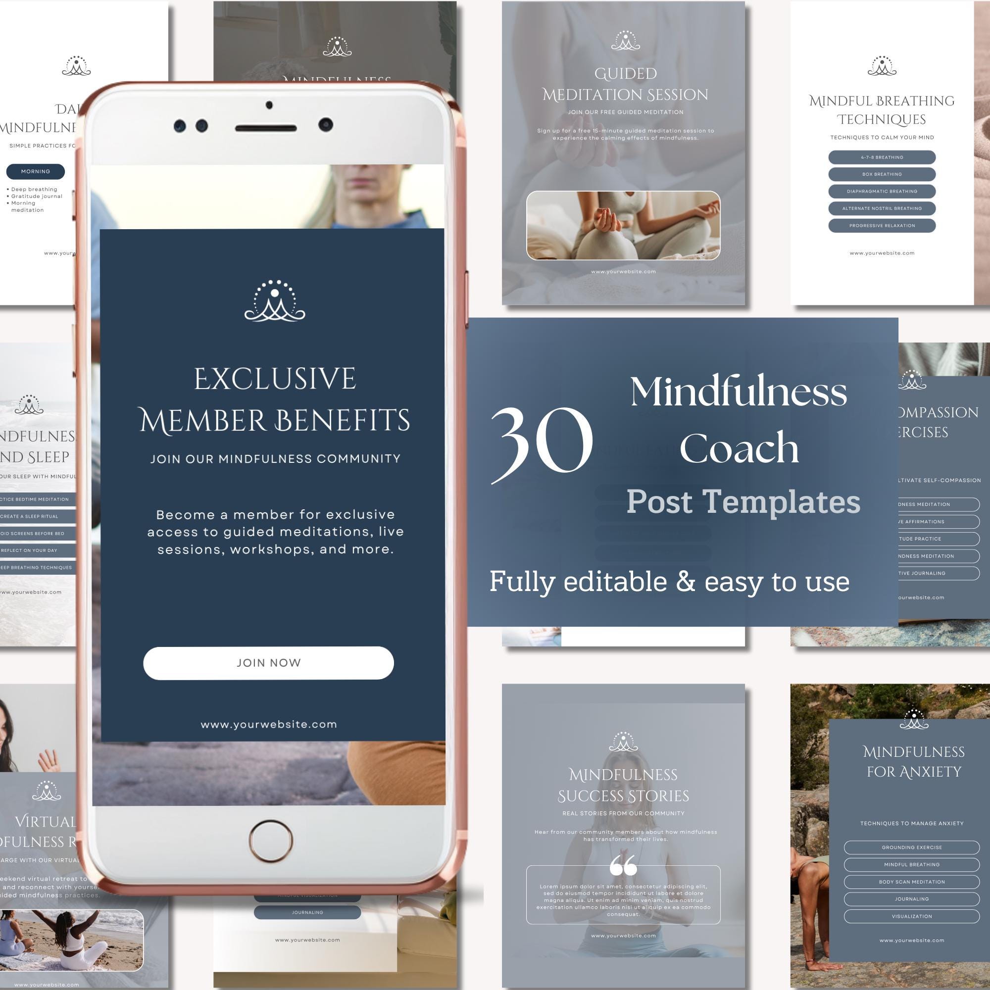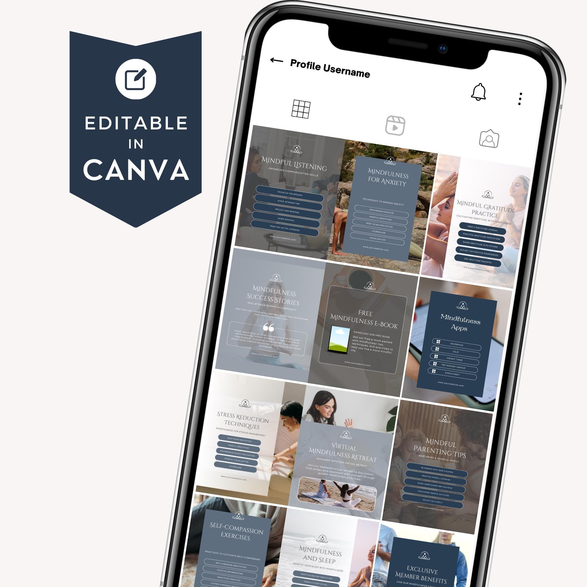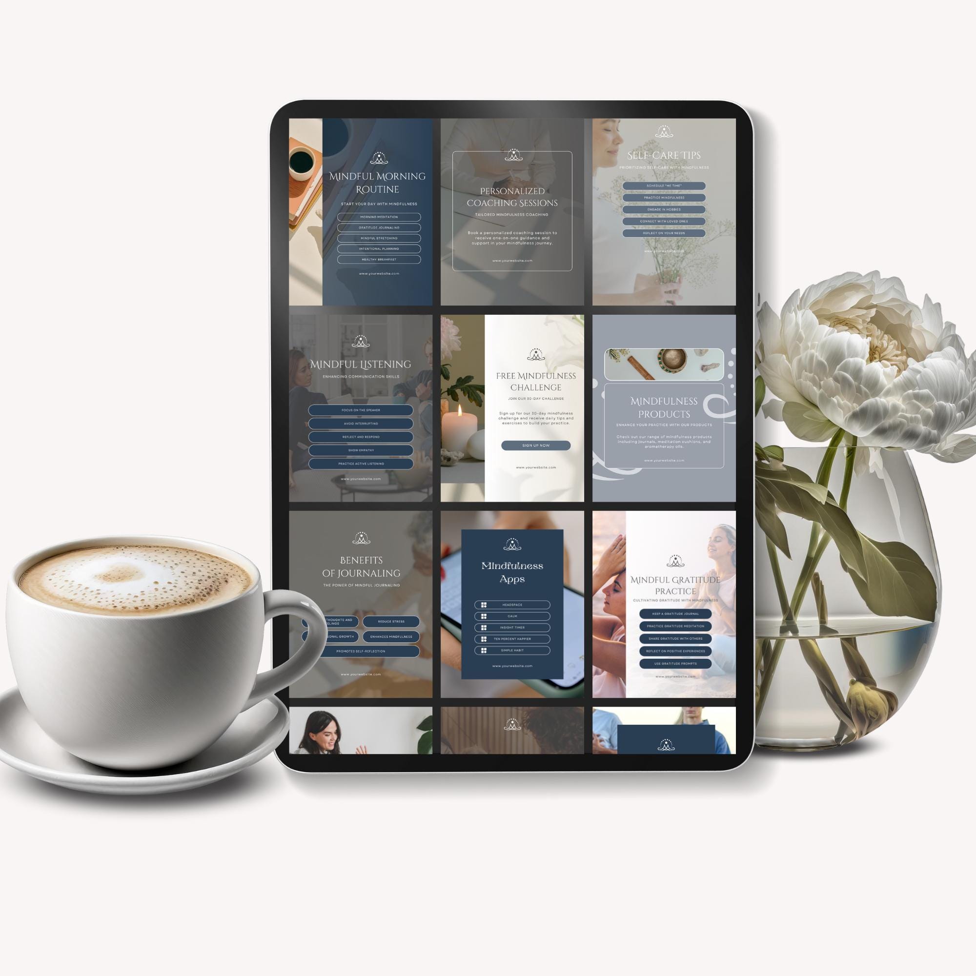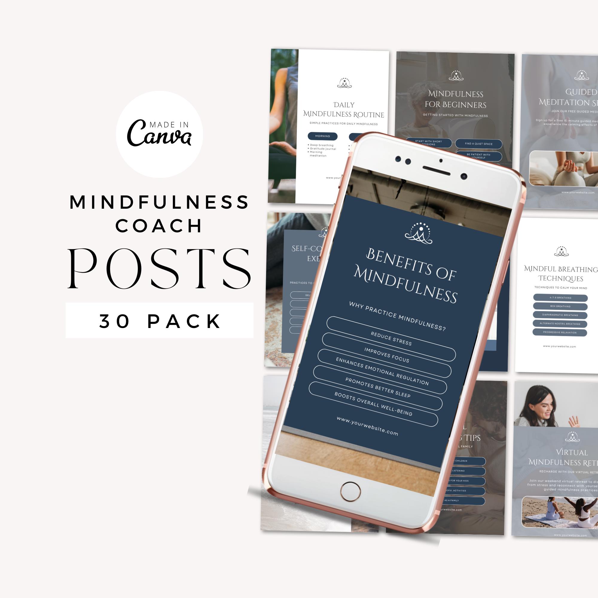 Designed for mindfulness coaches posting to social media, this Canva template offers educational content, inspirational quotes, self care tips, and much more.