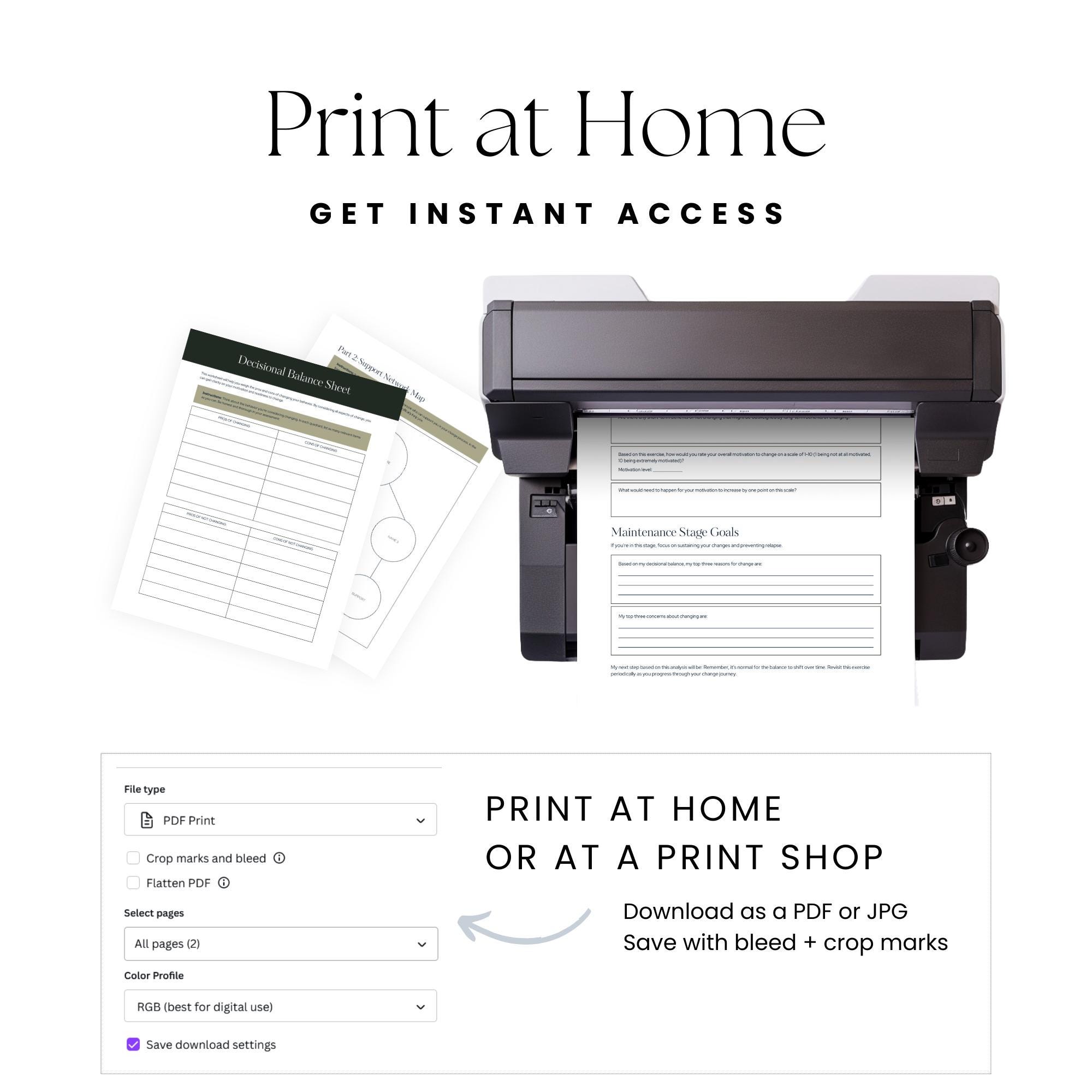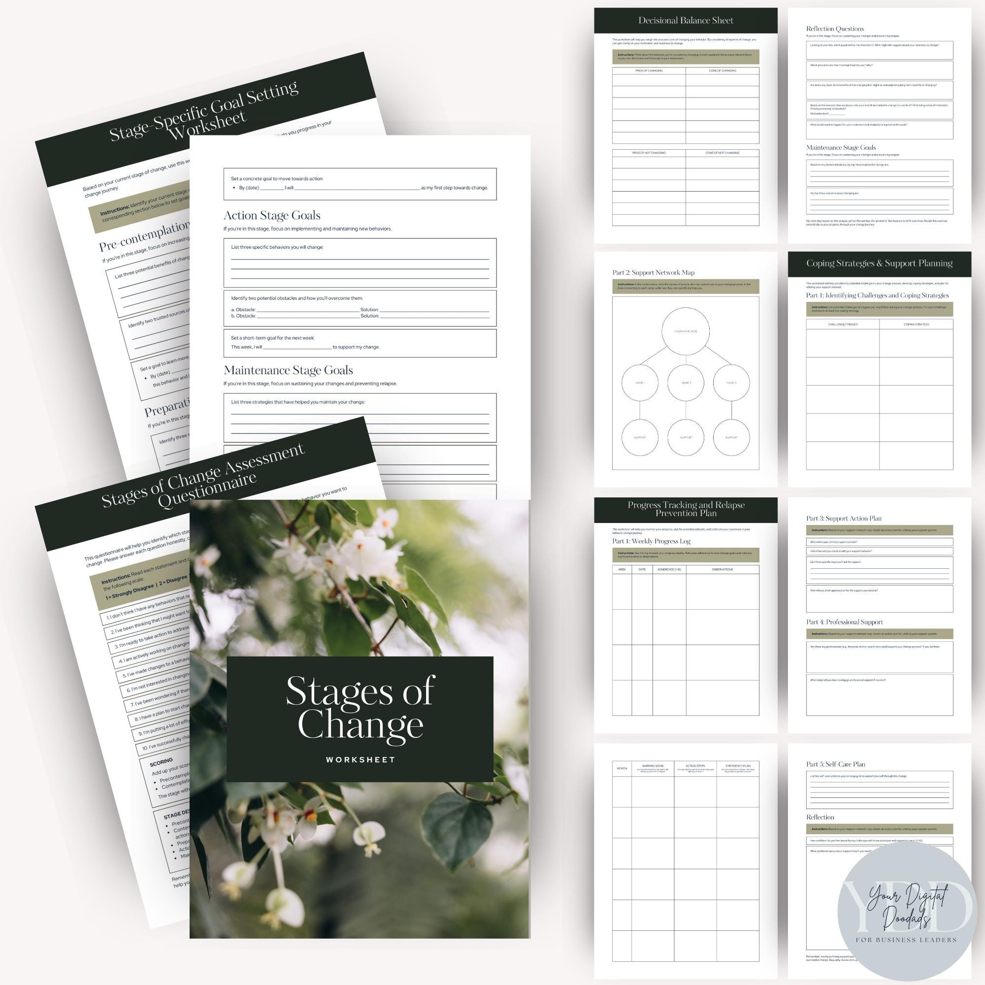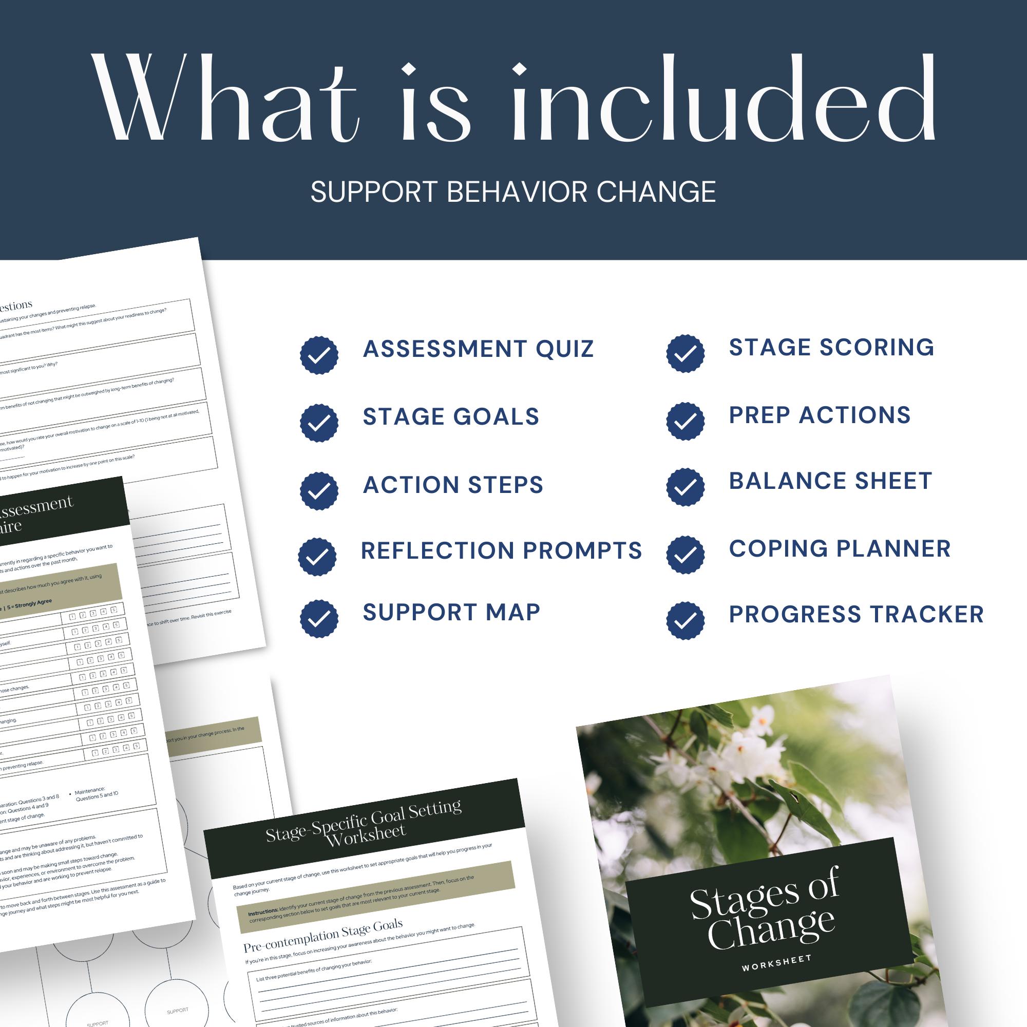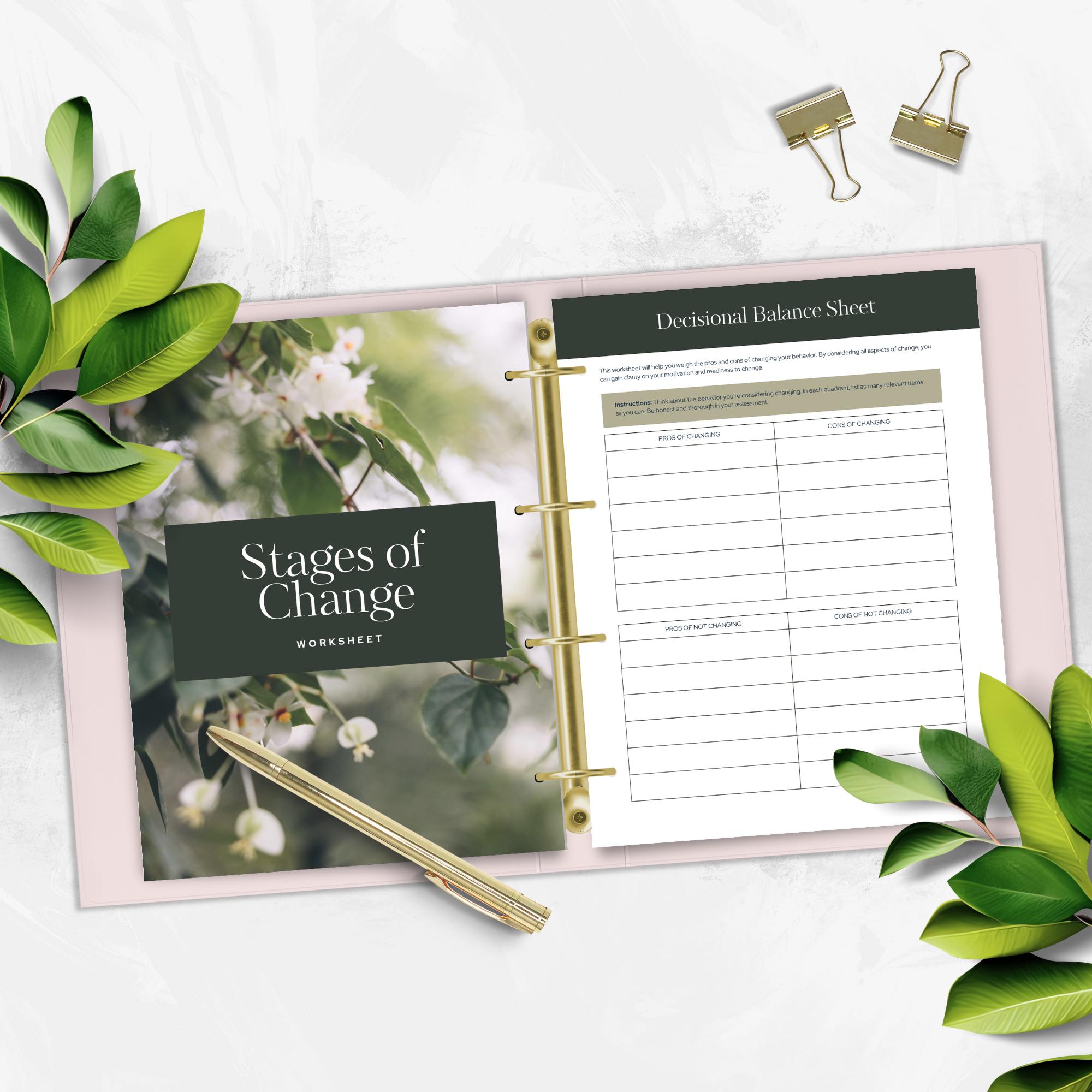 Help clients understand where they are in their change journey with this Stages of Change Worksheet Set. This printable PDF guides users through the five stages of change with an assessment, scoring guide, goal-setting pages, decisional balance sheets, coping strategies, support mapping, and relapse-prevention planning.
