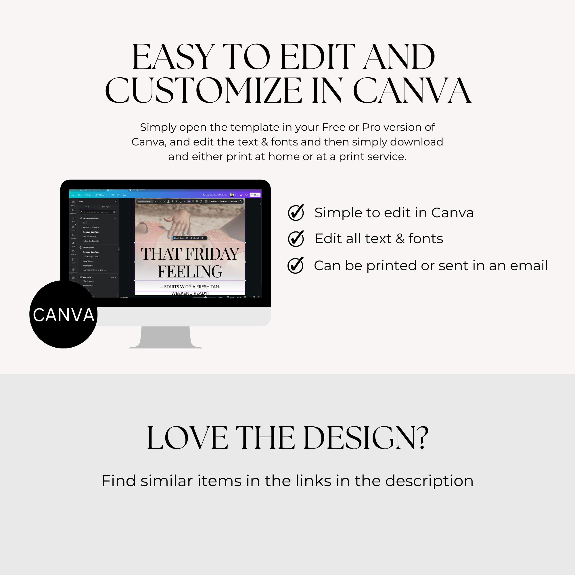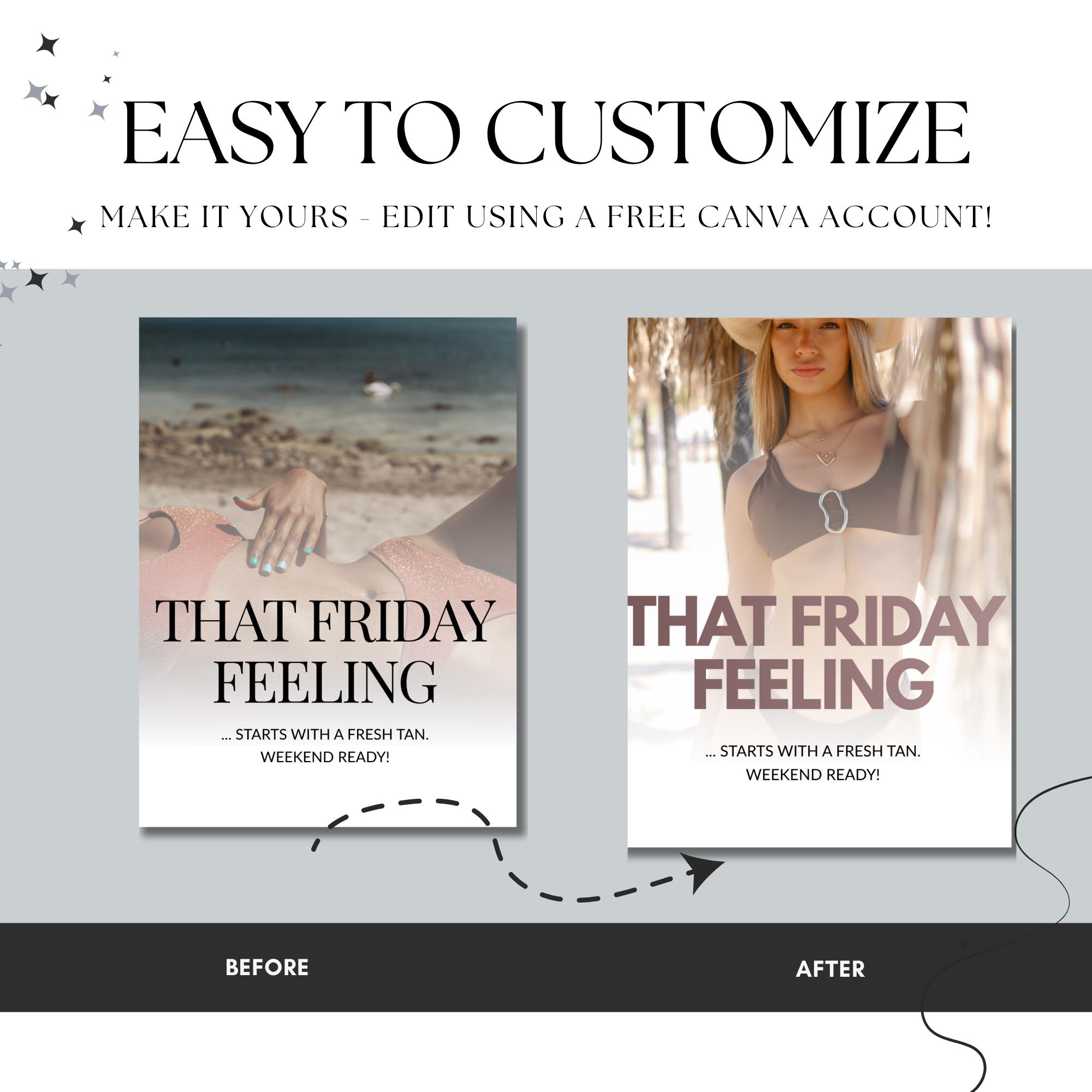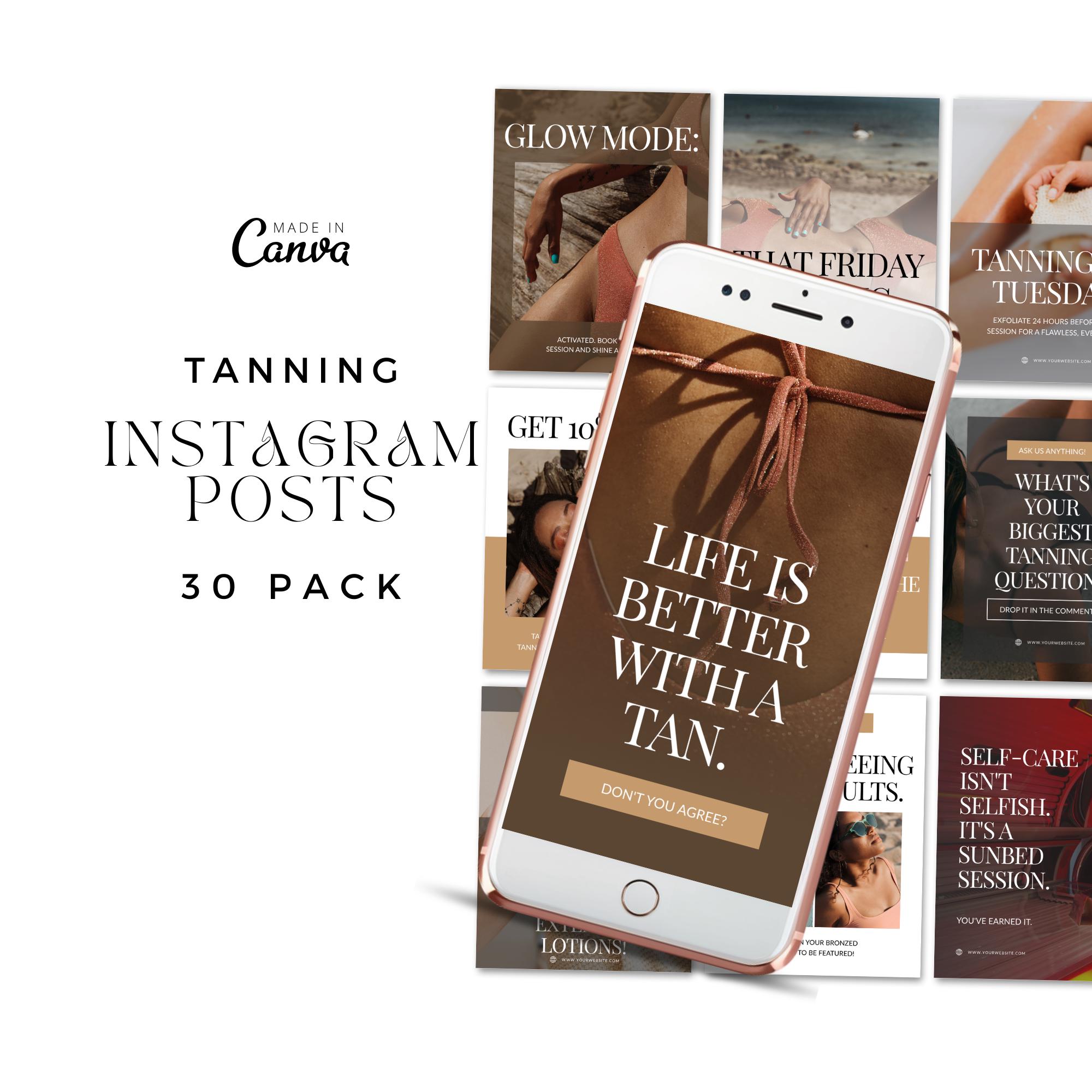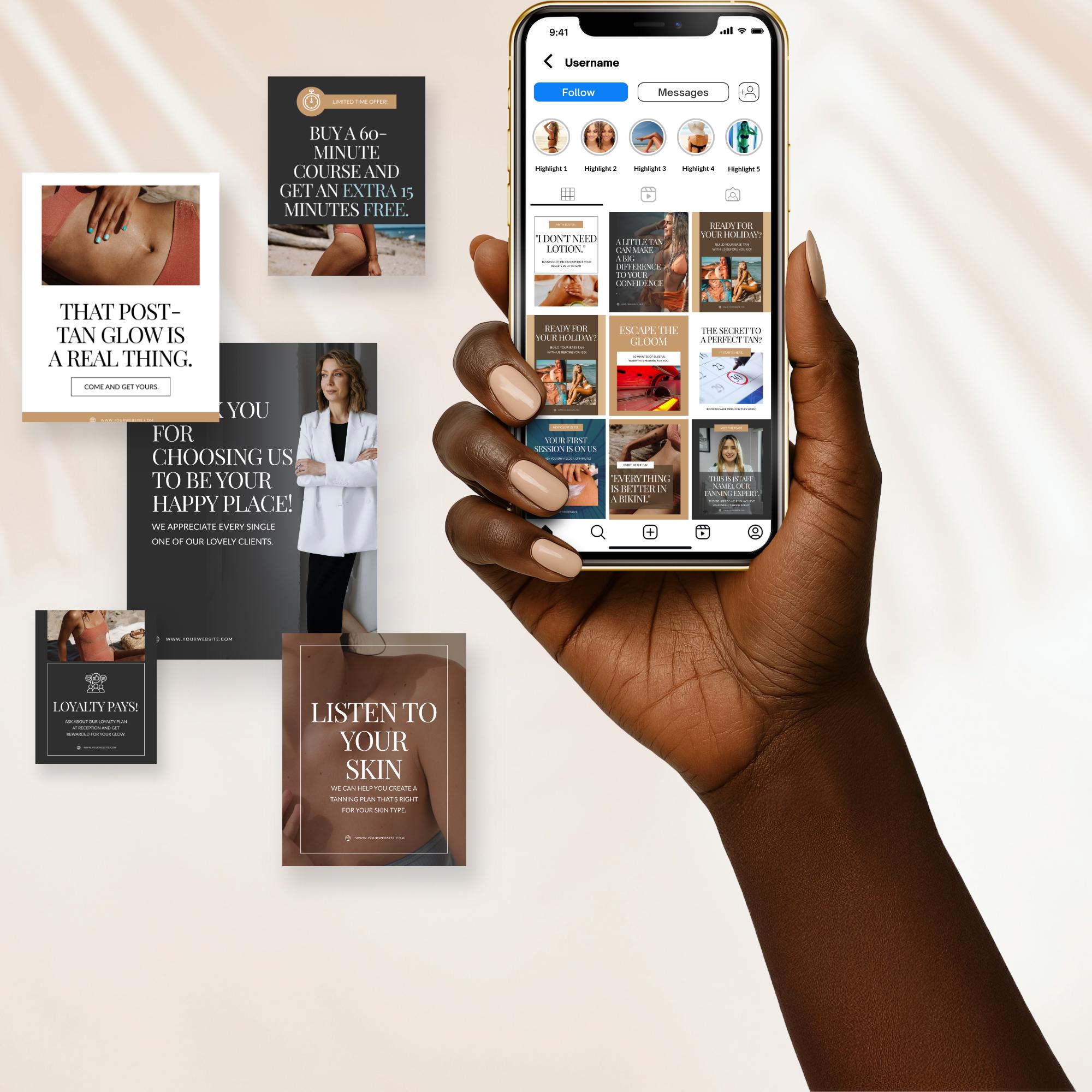 This Tanning Salon Social Media Kit includes 30 done-for-you Canva templates you can edit in minutes and post to Instagram or Facebook.