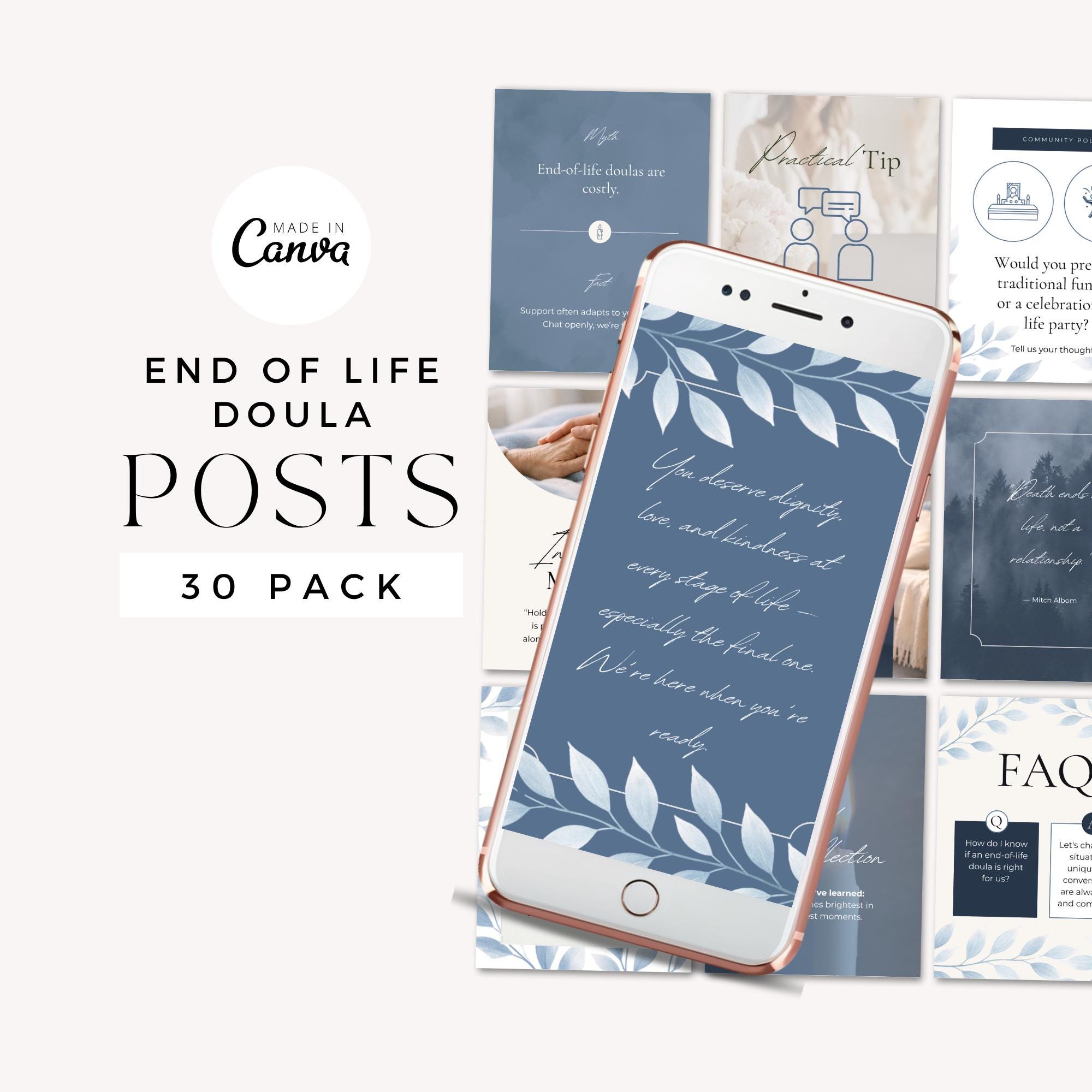 This editable Canva template bundle gives end-of-life doulas, death doulas, grief workers, and caregivers ready-to-use social media posts designed to educate, comfort, and open meaningful conversations.