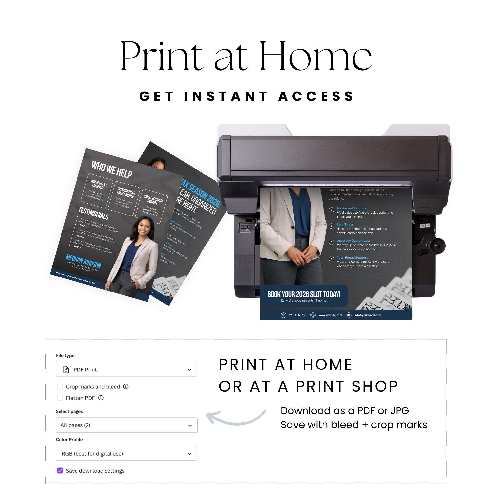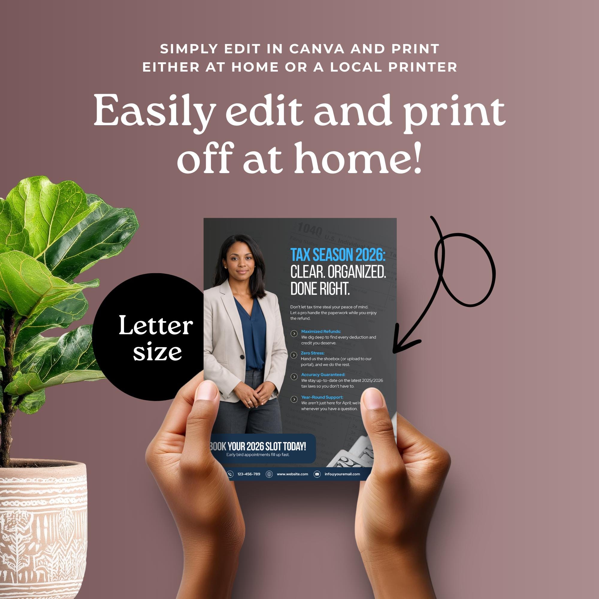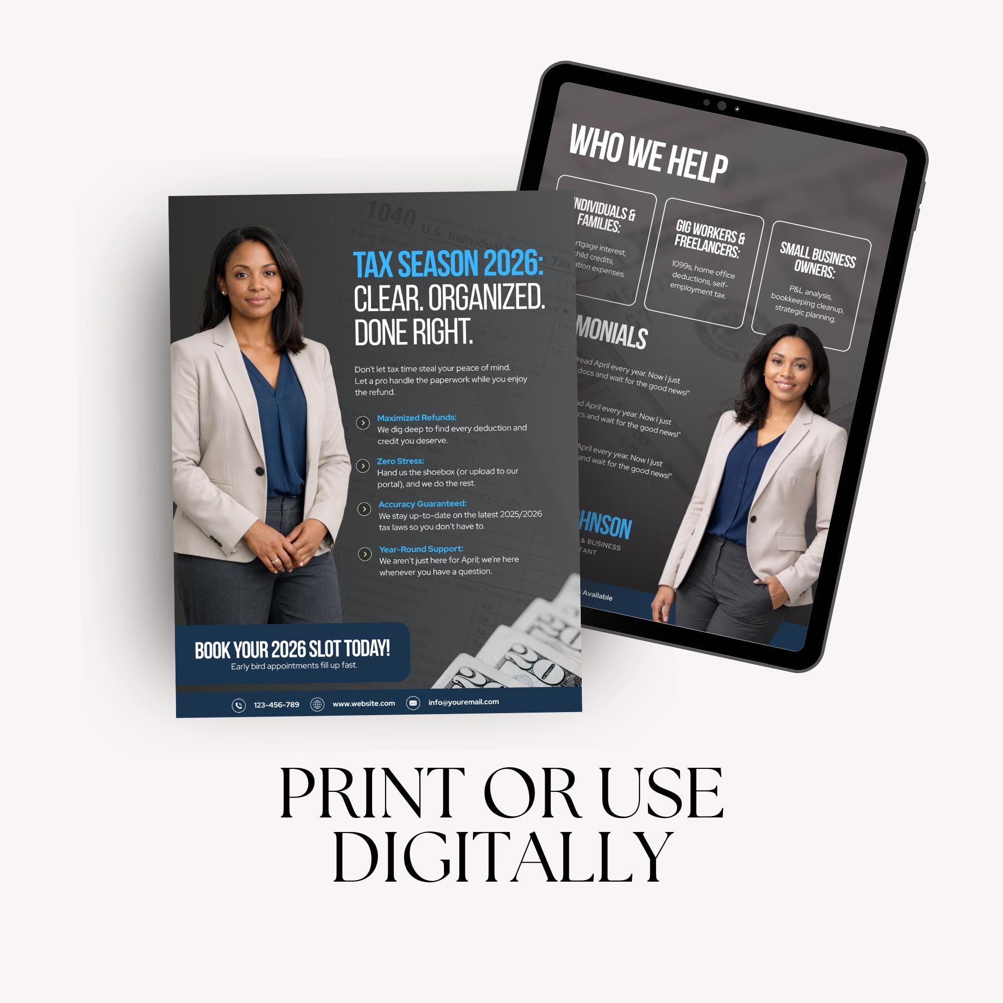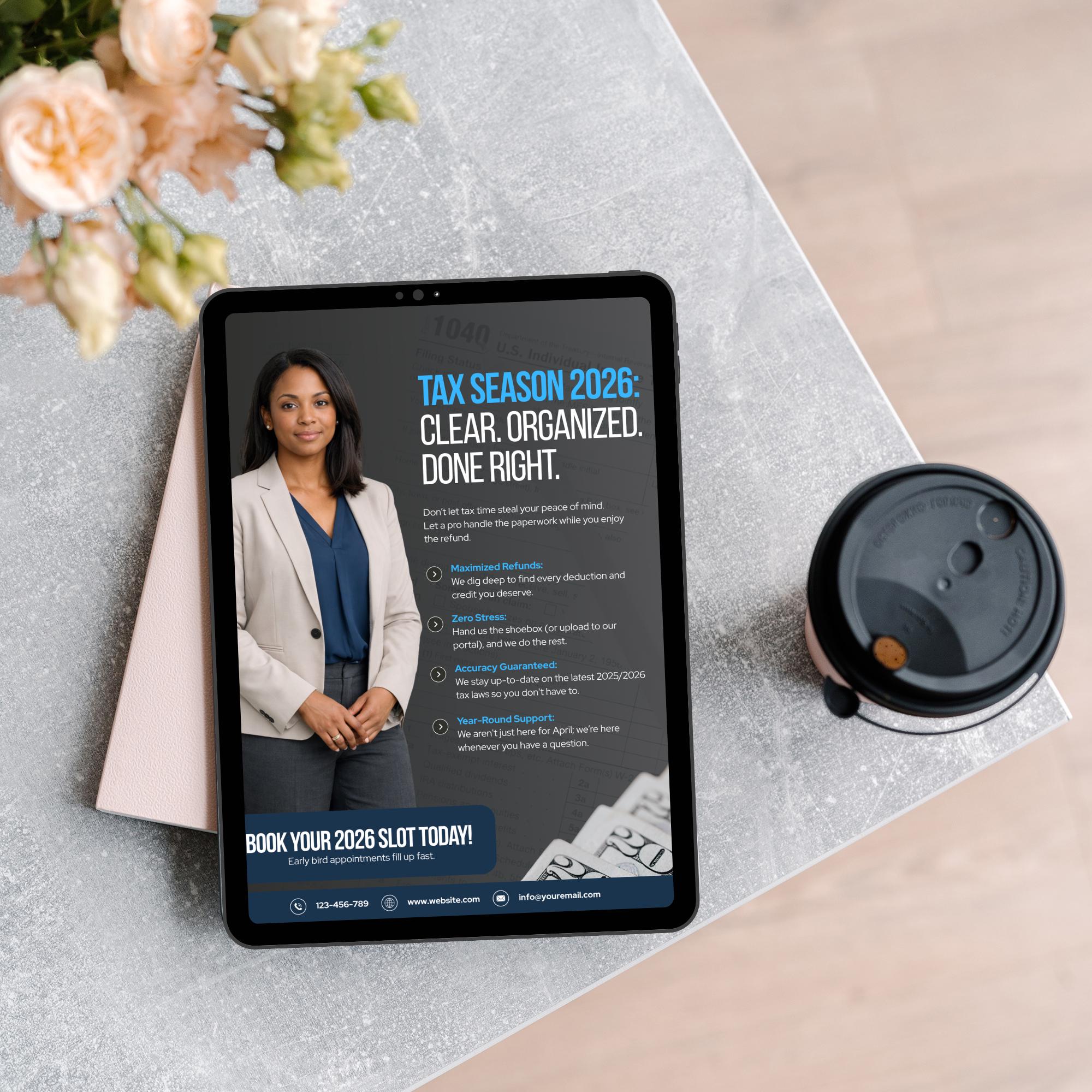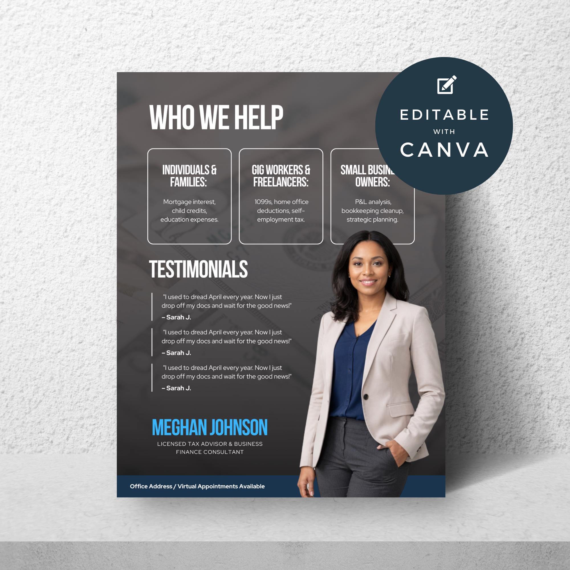Whether you’re an independent tax preparer, CPA, bookkeeper, or financial consultant, this template gives you a clean, professional marketing asset you can customize in minutes.