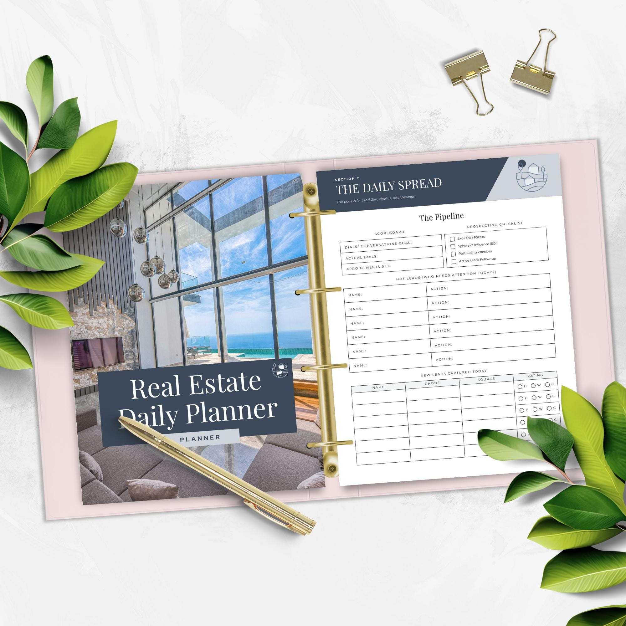 Inside, you’ll find space to plan your schedule, track non-negotiables, manage transactions, monitor your pipeline, capture new leads, log property tour details, and map out your monthly closings and income goals. Whether you’re building momentum or managing a full pipeline, this is your daily “secret weapon” for staying organized and closing more deals.