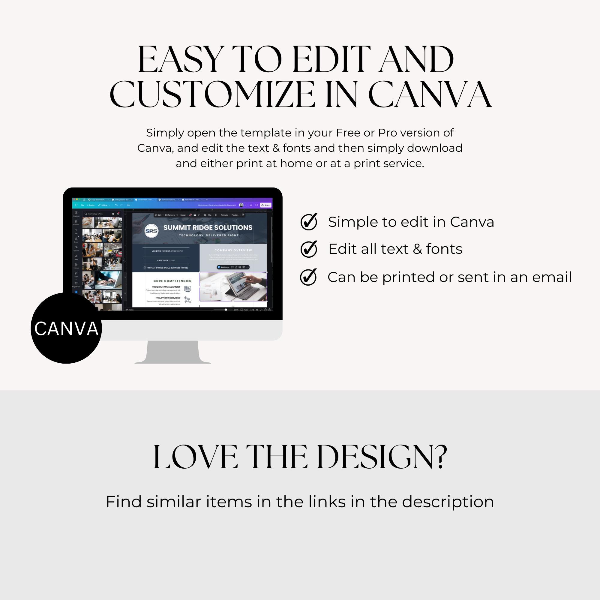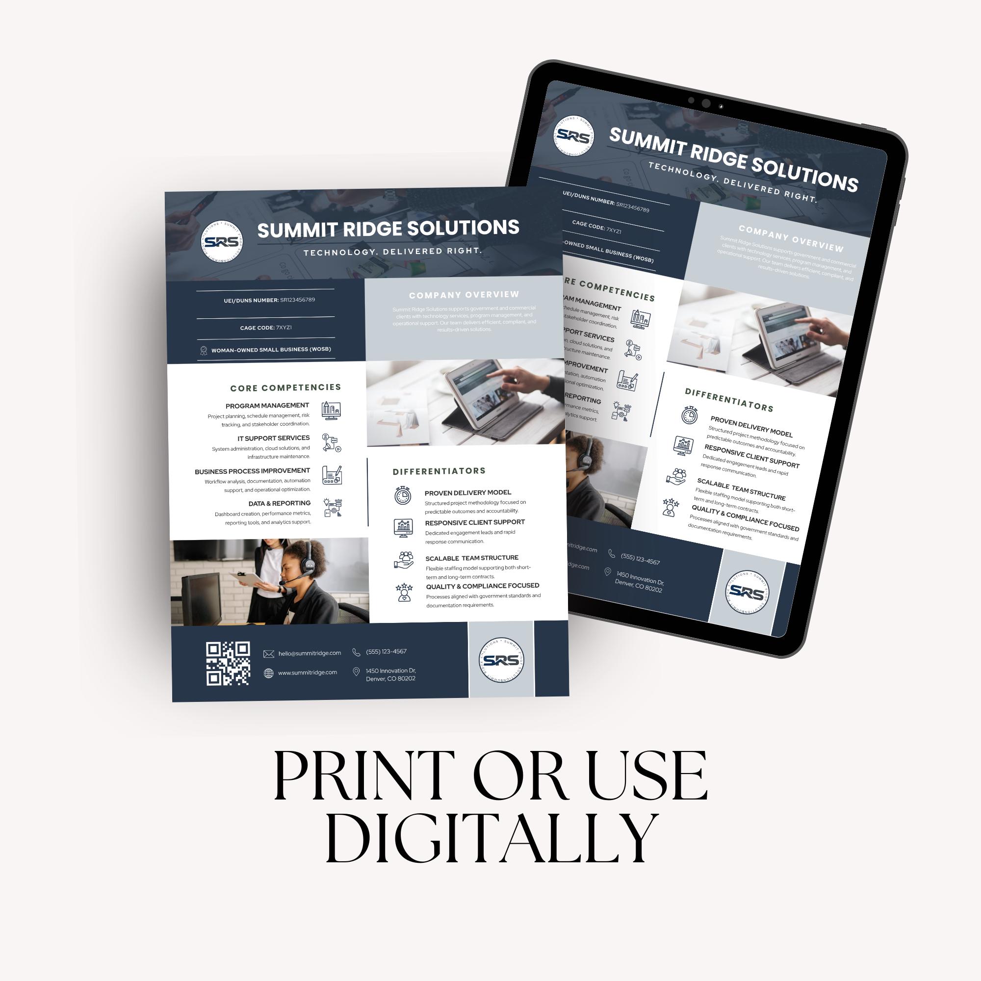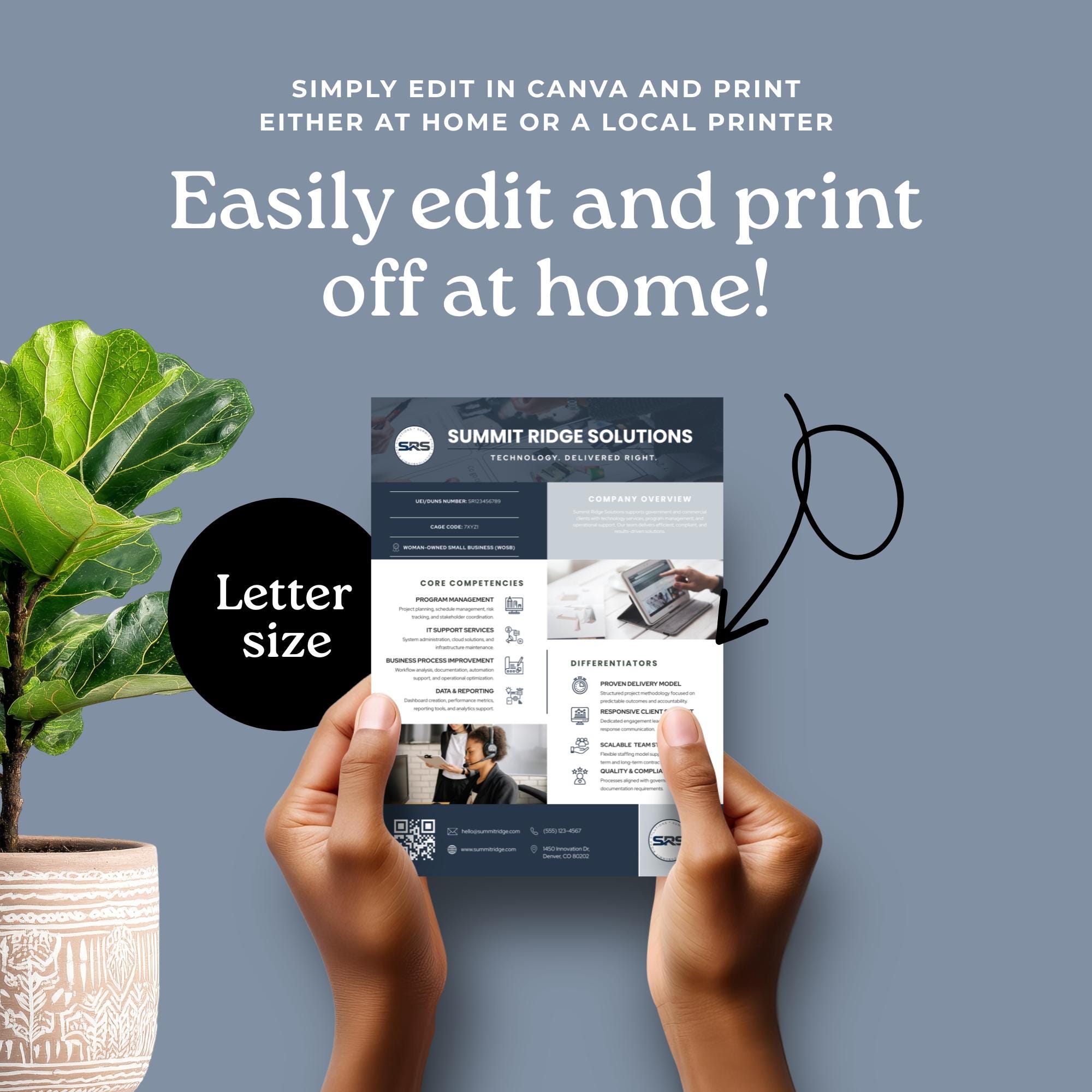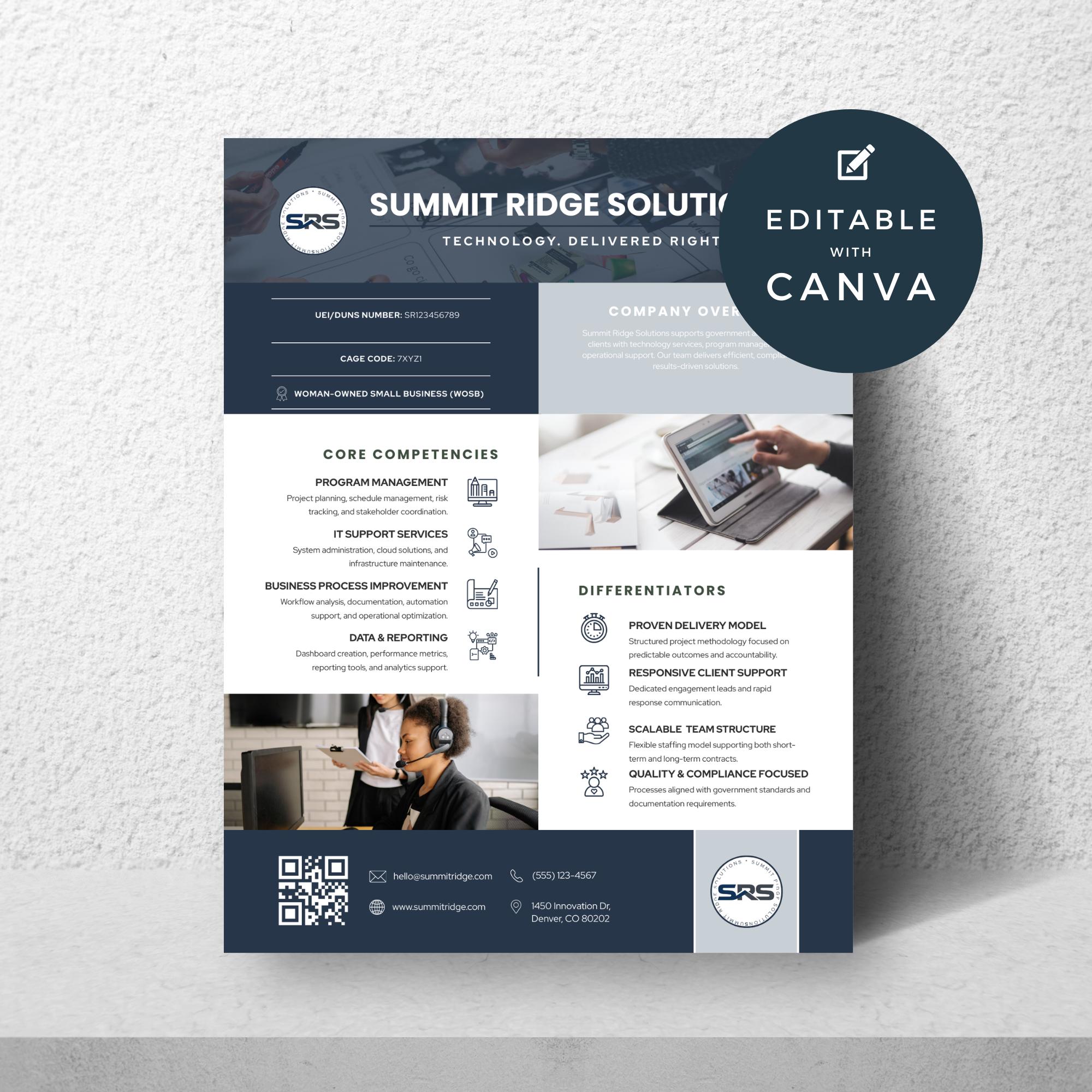This editable Canva Capability Statement Template is designed for service businesses, consultants, agencies, and government contractors who need a polished one-page company profile fast. Perfect for SAM registration, subcontracting opportunities, proposal submissions, networking events, or vendor outreach.