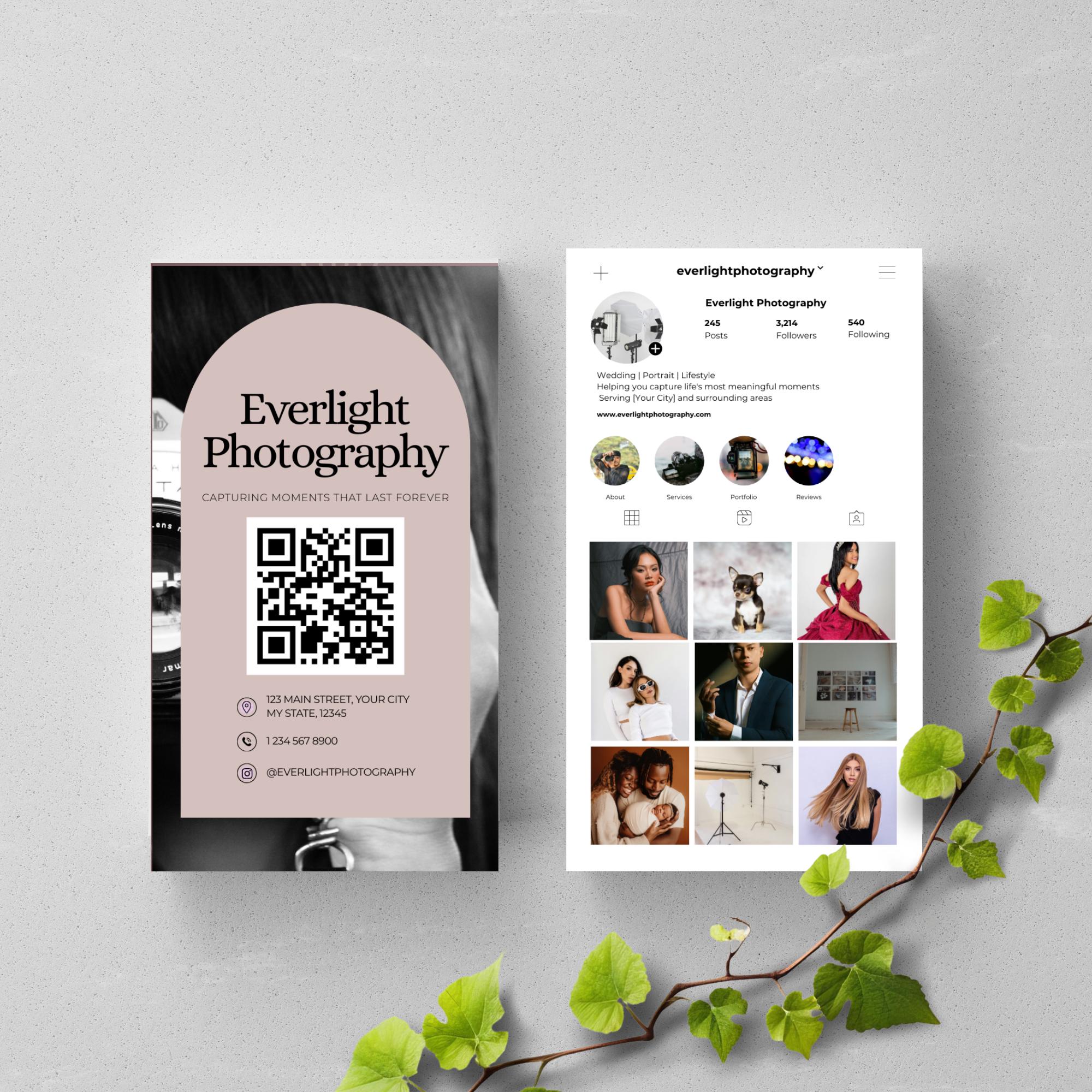 This Canva-editable photographer business card lets you add your Instagram handle, contact details, and a QR code that links directly to your profile.