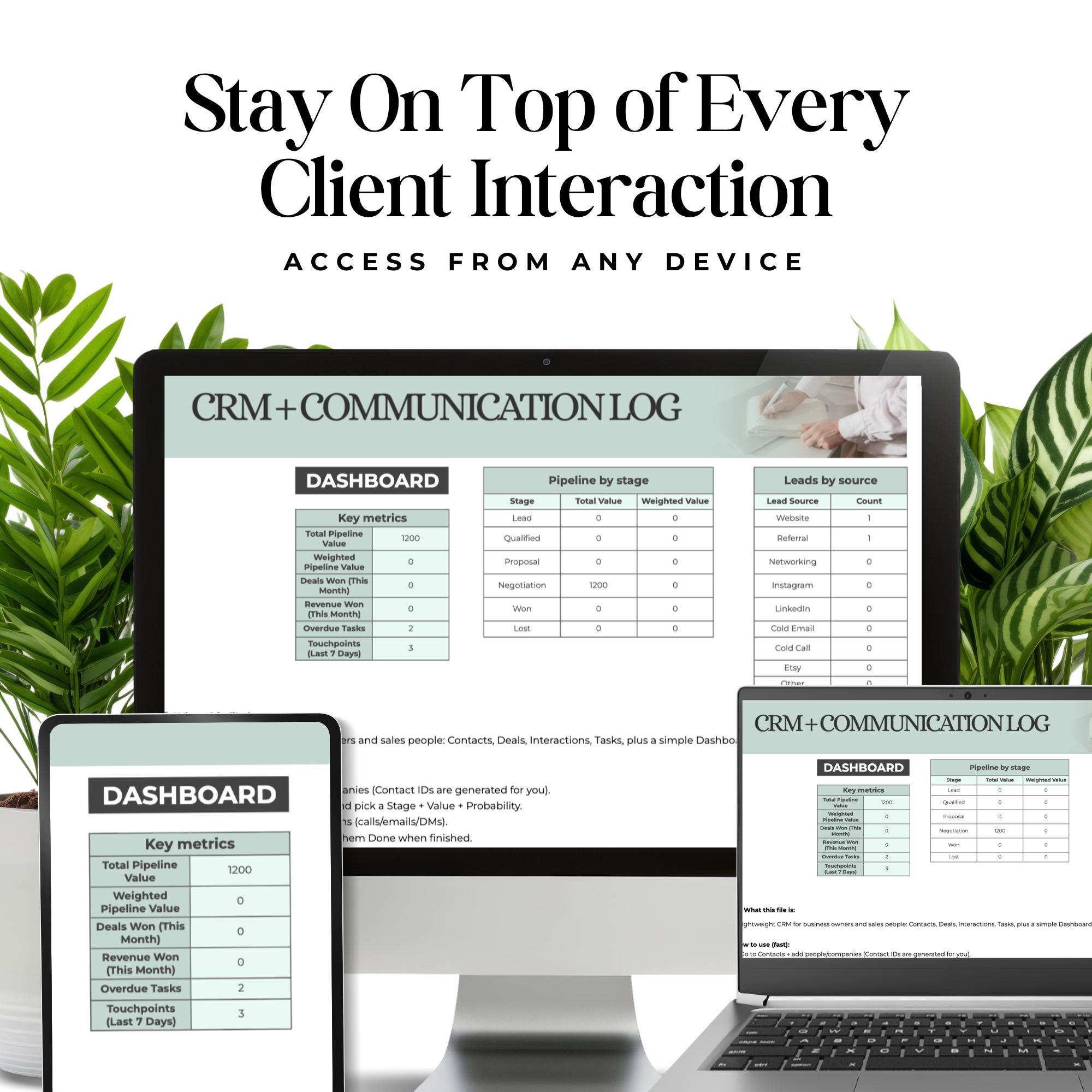 This CRM + Communication Log Google Sheet is a lightweight, ready-to-use system built for freelancers and solopreneurs who need to manage clients and sales without the complexity or cost of a full CRM platform. No subscriptions, no learning curve, no extra software required.