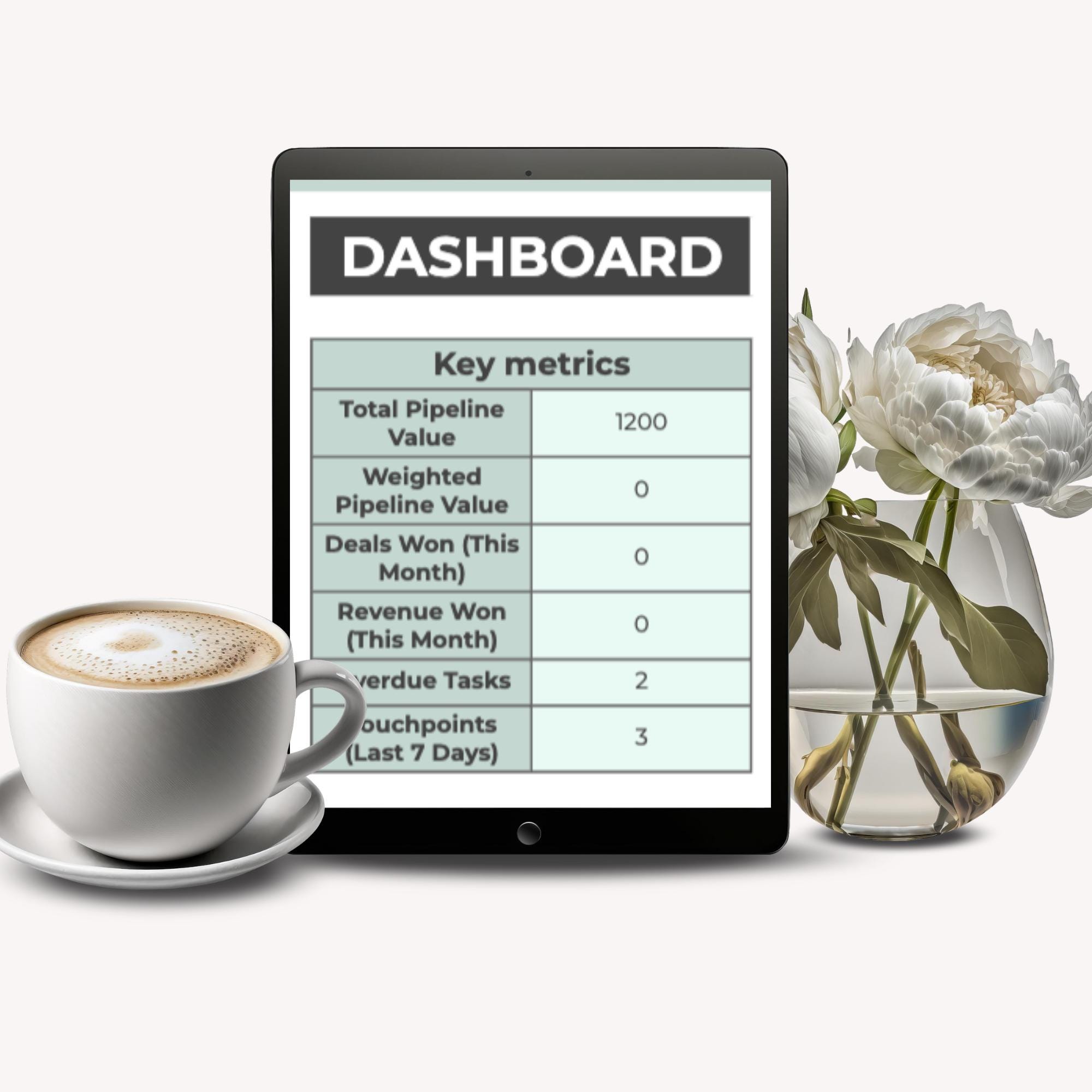 - Dashboard with auto-calculated metrics: pipeline value, deals won, revenue, overdue tasks, and recent touchpoints