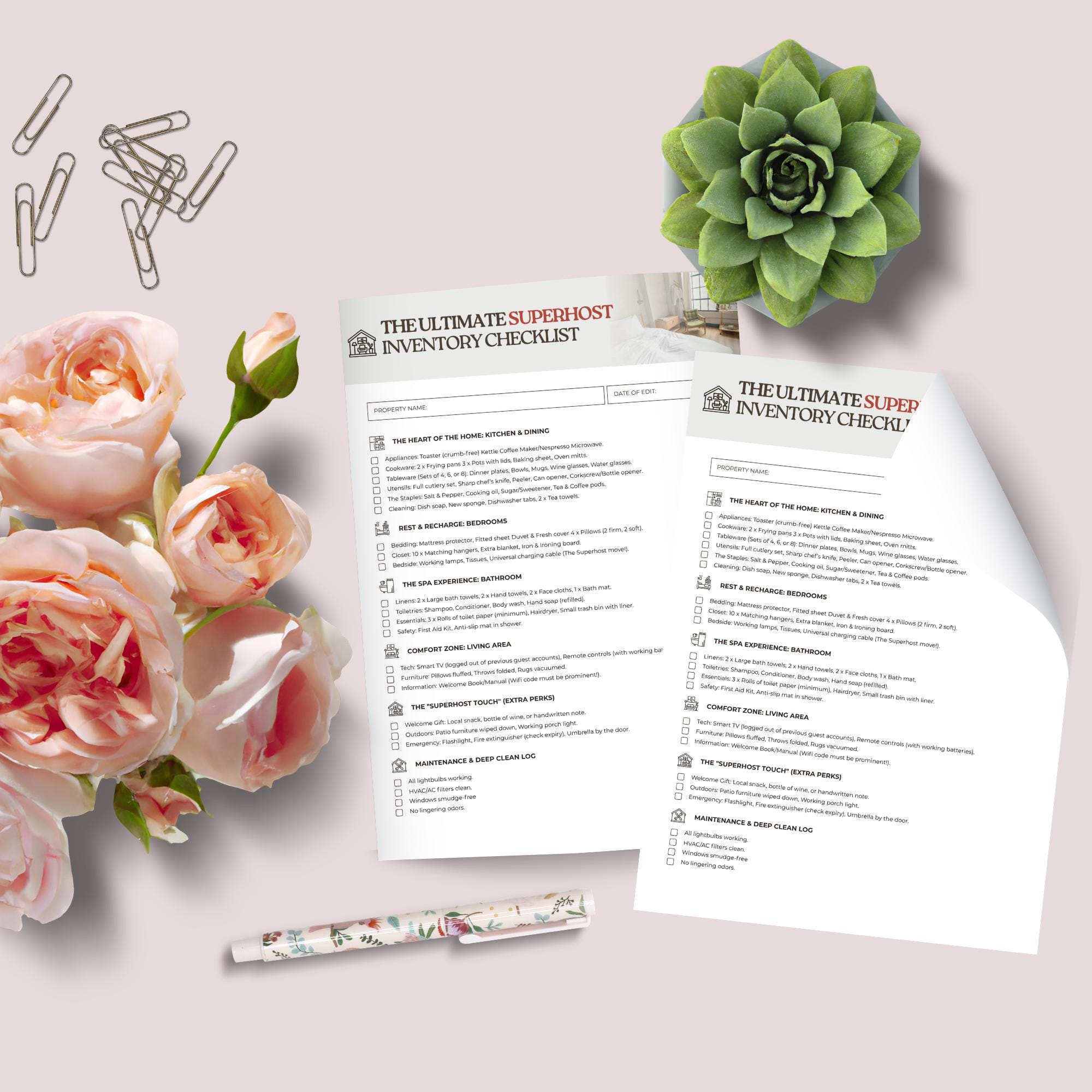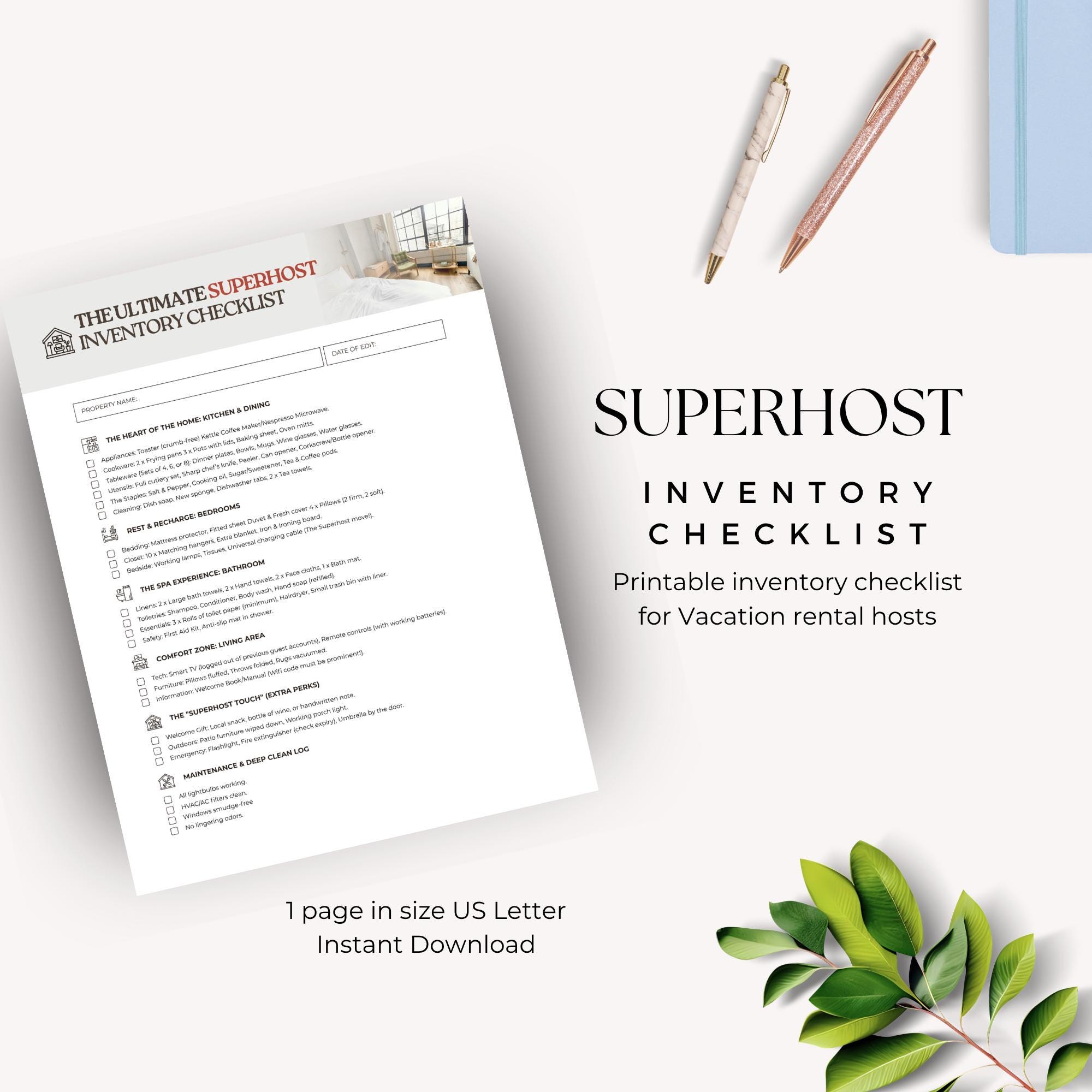 - Superhost Inventory Checklist (Printable PDF) A comprehensive checklist to make sure your rental is fully stocked and guest-ready before every stay. Print it out and check off items room by room so nothing gets missed.