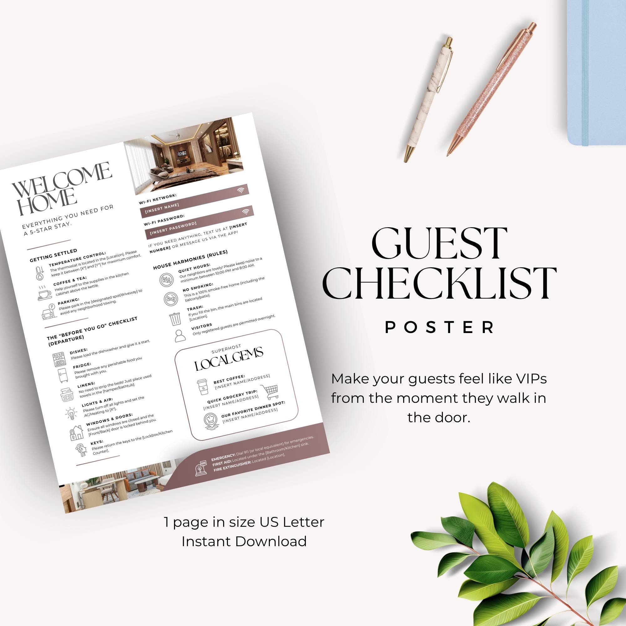 - Guest Checklist Poster (Canva Template) A beautiful, customizable poster your guests will actually read. Edit the text in Canva to match your house rules and checkout instructions, then print or display digitally.
